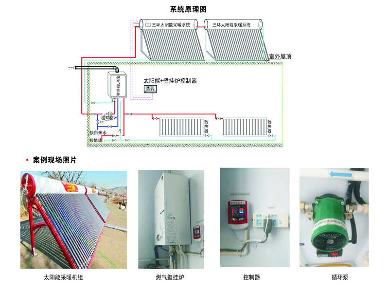 2臺58*1800-30支太陽能采暖專用機、20kW采暖專用壁掛爐、6m揚程太陽能循環泵、采暖末端(600型-18柱暖氣片兩組)、專用熱水循環管路及自動控制系統。